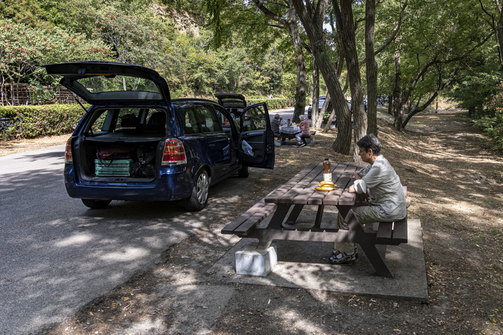 Die Mittagspause verbringen wir auf einem gut besuchten Rastplatz an einem kleinen Fluss, an dem sich allerlei Unrat angesammelt hat, u. a. zahlreiche Papiertaschentücher. Das ist nicht weiter verwunderlich, denn die beiden Toilettenhäuschen am anderen Ende des Rastplatzes sind „en panne“, also außer Betrieb.